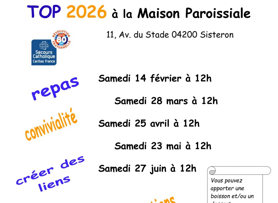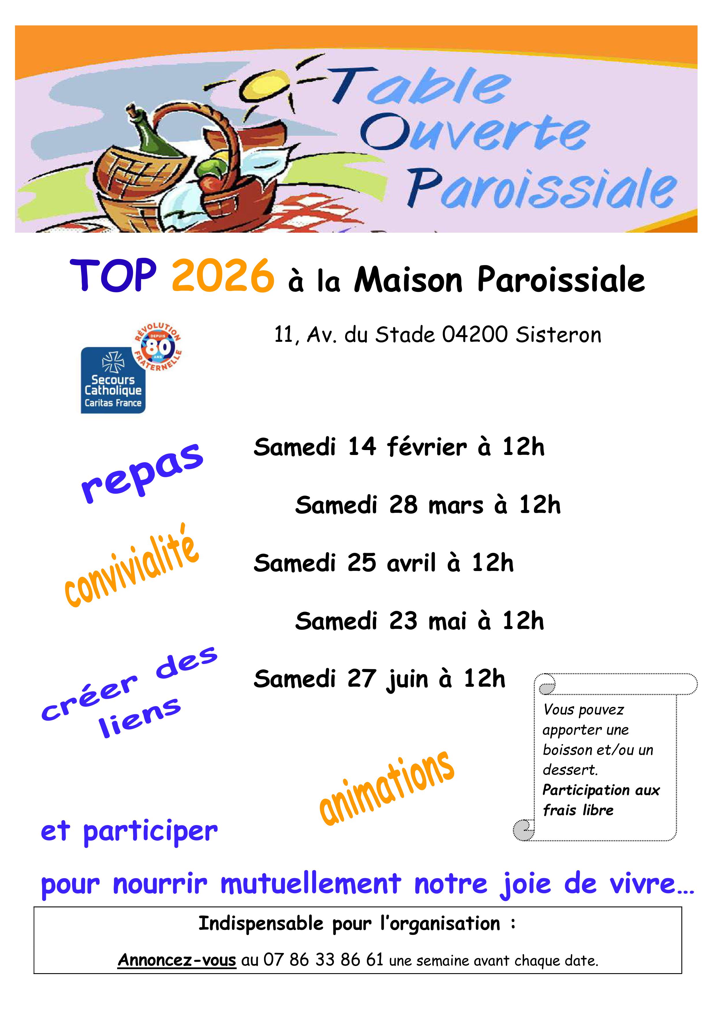 Nous sommes heureux de vous annoncer le lancement d'une série de Tables Ouvertes Paroissiales, à Sisteron.